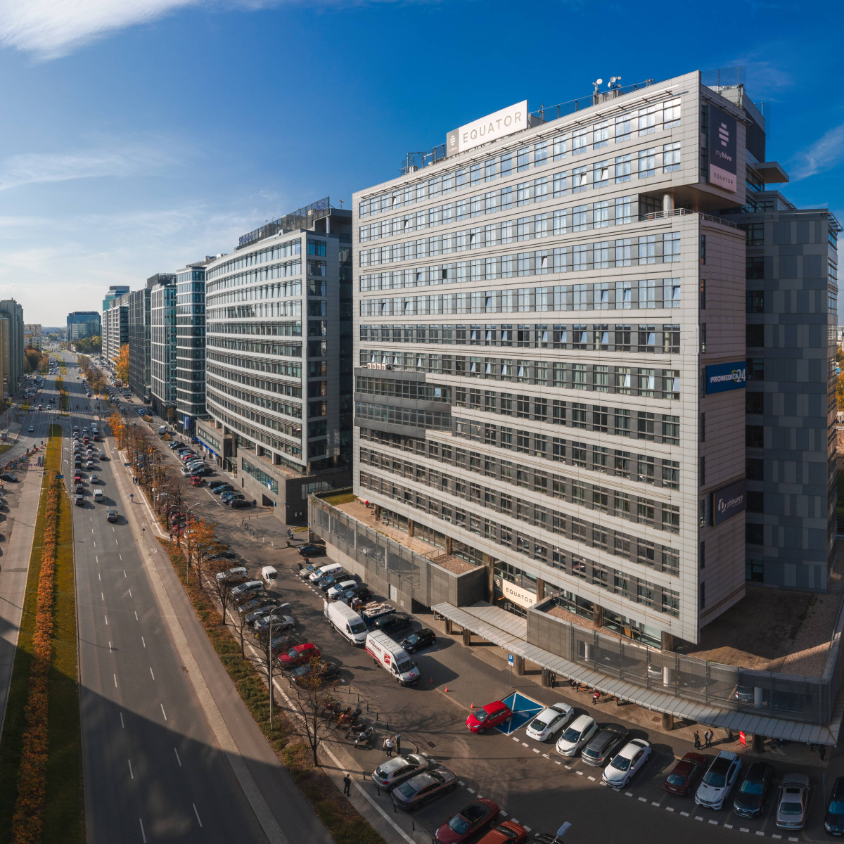 Equator II is a modern office building located in Warsaw’s Ochota district. Thanks to its excellent location, Equator II provides convenient access to key points of the city: the city centre, Warsaw West railway station and the airport, while the main transport routes in the area make getting to the office space both easy and convenient.