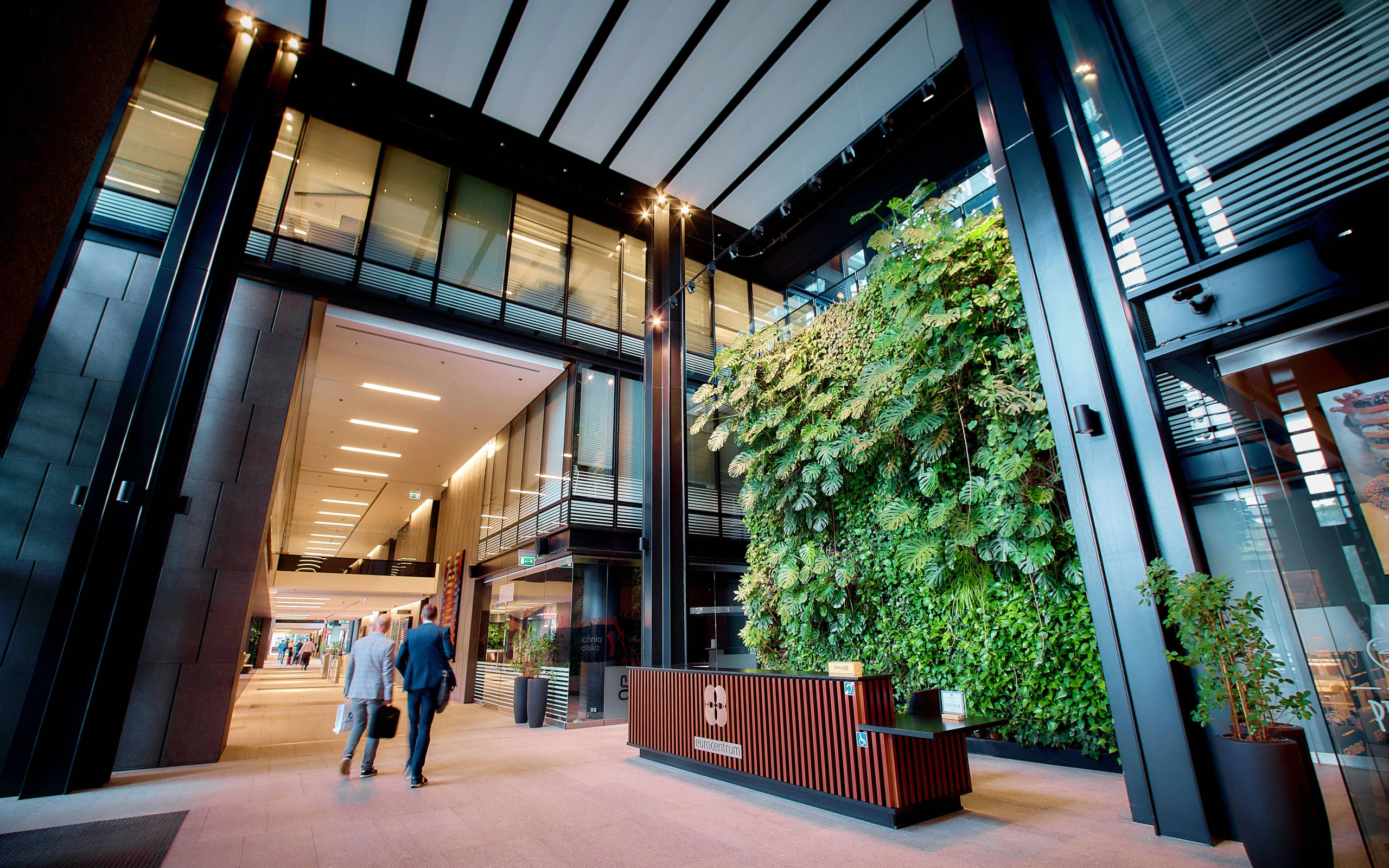 Eurocentrum Office Complex comprises several buildings with a high standard of finish, providing comfortable working conditions and access to modern amenities. Each office for rent in Eurocentrum Office Complex is fitted with modern technological systems enabling effective work organisation. An additional advantage is the option of flexible office space arrangement, which allows the area to be adjusted to the individual needs of the tenant. This is a place for companies that care about the environment and work comfort and see their headquarters through the prism of long-term, economic solutions. The building was built in line with sustainable construction principles through the use of environmentally friendly materials and solutions, for which it has been awarded a LEED ‘Platinum’ certificate. The common areas feature more than 1,500 sqm of green atria, which, together with the shopping and services passage and other amenities, have a positive impact on the comfort of employees.