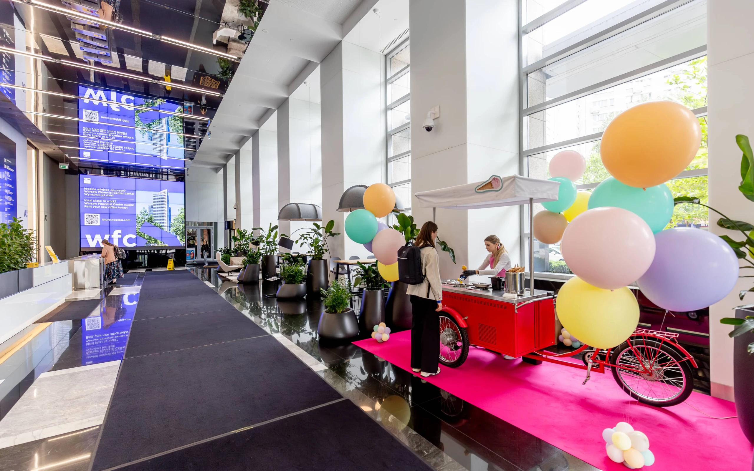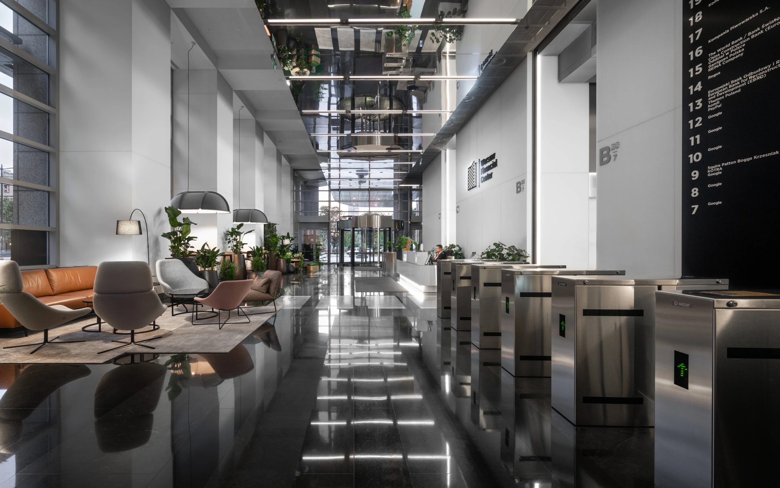 WFC posiada również reprezentacyjne i wielofunkcyjne lobby z zieloną strefą wypoczynkową oraz przestrzenią do pracy wyposażoną w ładowarki oraz ogólnodostępne Wi-Fi dla najemców i gości.